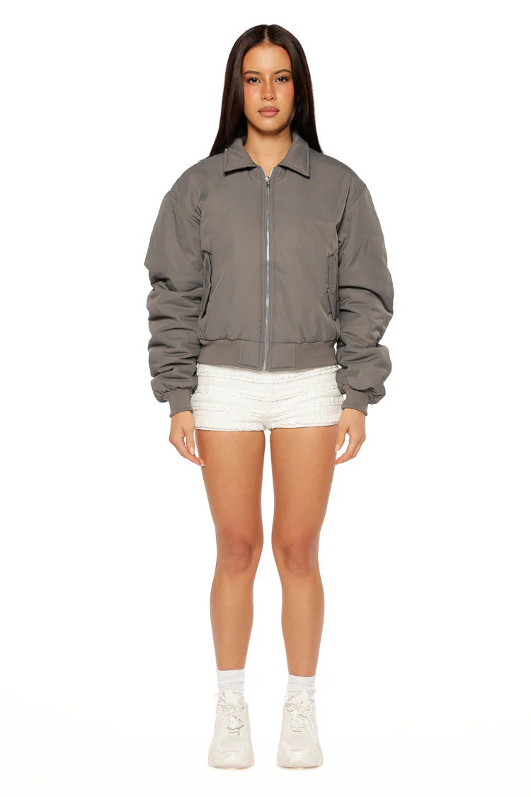 Elevate your with our Benson Grey Puff Bomber Jacket, the perfect layering piece for cooler days! This padded bomber adds a sophisticated twist to a classic silhouette, featuring a unique ruching detail across the back and down the sleeves. Layer it over a and pair with chunky for a confident, fashion-forward look.